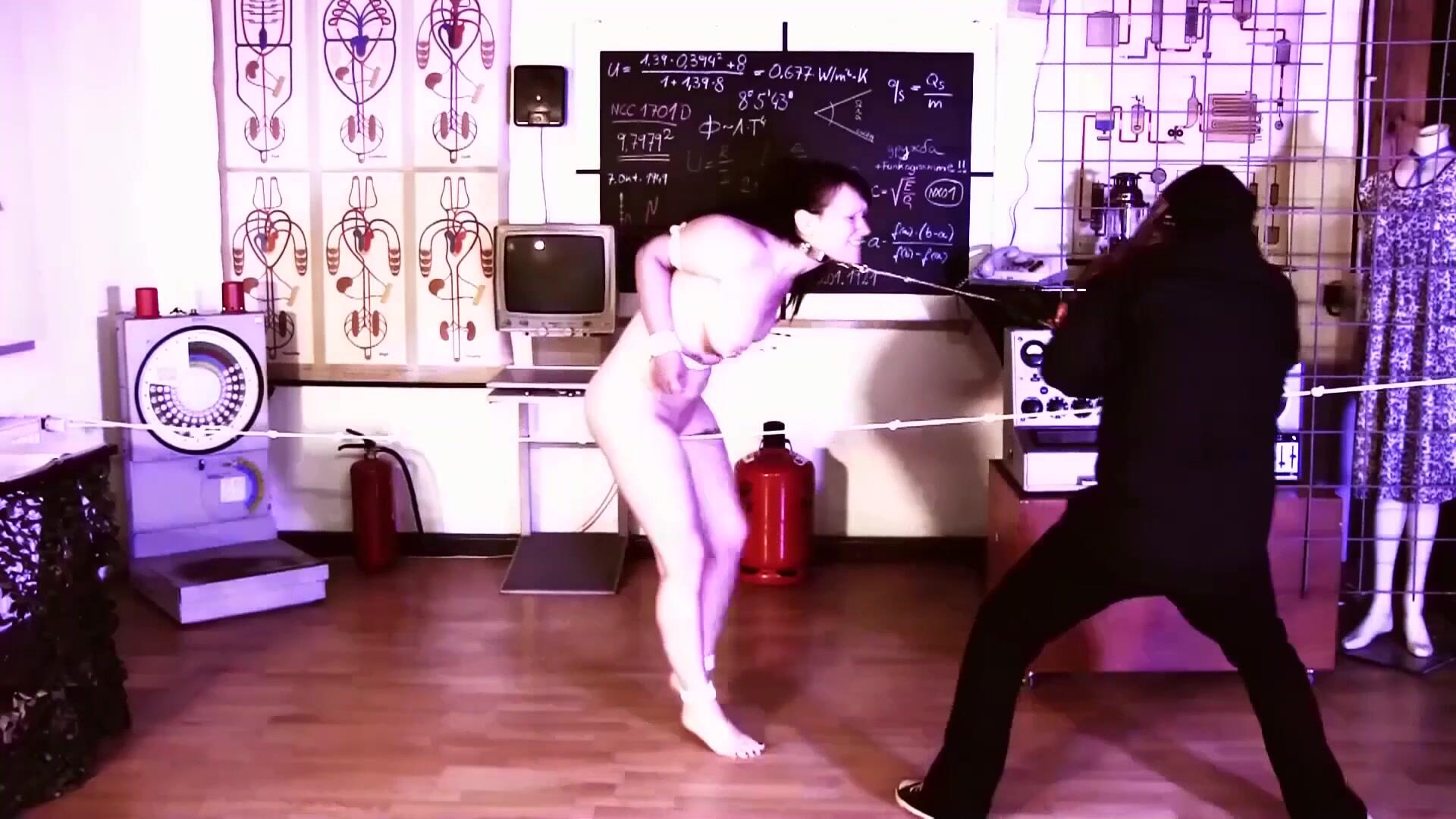 Objekt 5 wird heute auf extreme Belastbarkeit getestet. Sie wird in einen Pranger gesperrt. Ihr werden mit Stufe blau die Korsage und die sexy Lackleggings entfernt. Mit Hilfe von Klammern und schweren Steinen werden ihre Nippel langgezogen. Ihr Arsch und Rücken werden mittels einer großen Peitsche bearbeitet.
